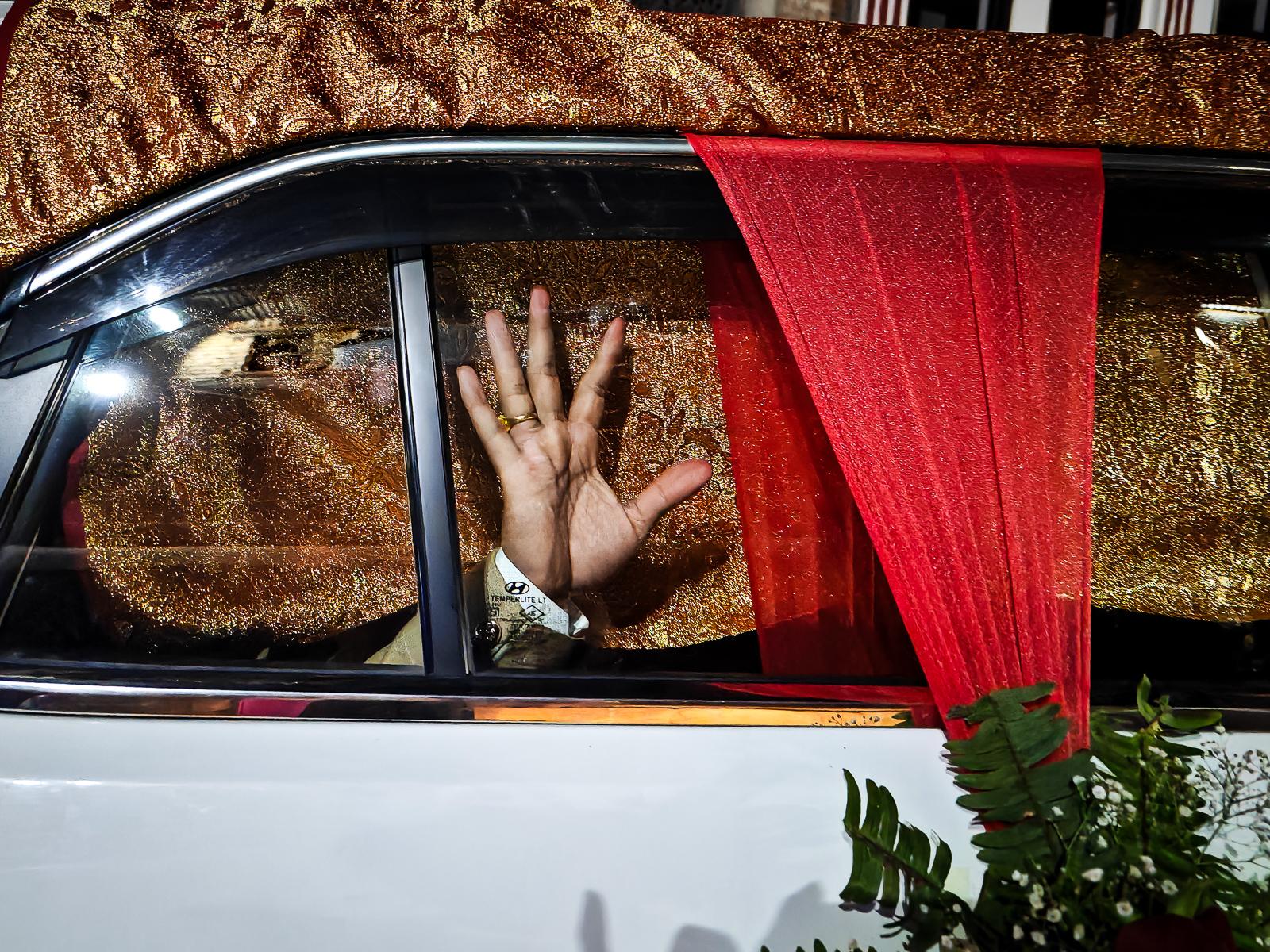 A groom waves enthusiastically while passing by during a ceremonial procession for a wedding in Bhaktapur, Nepal.