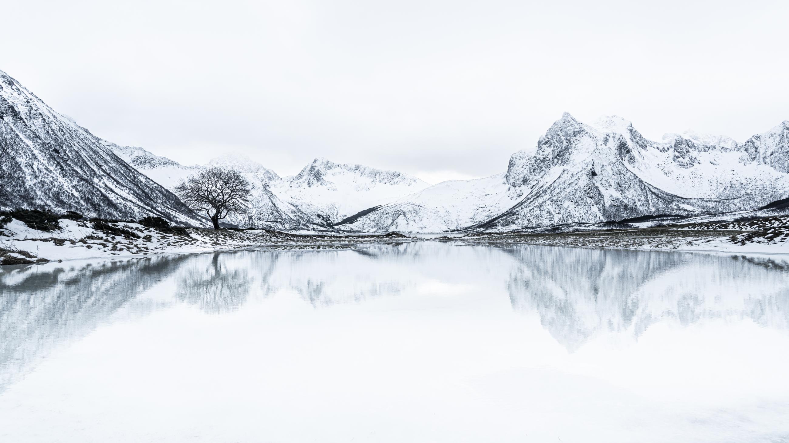Winter on Norway’s Lofoten Islands is just beautiful and magical. This mountain panorama, with the lonesome tree and its reflection in the small lake, caught my eye. Desaturating the photograph in post-production seemed a natural way to highlight the icy character of the scene and its great contrasts. This is a single exposure, cropped into a panoramic format.