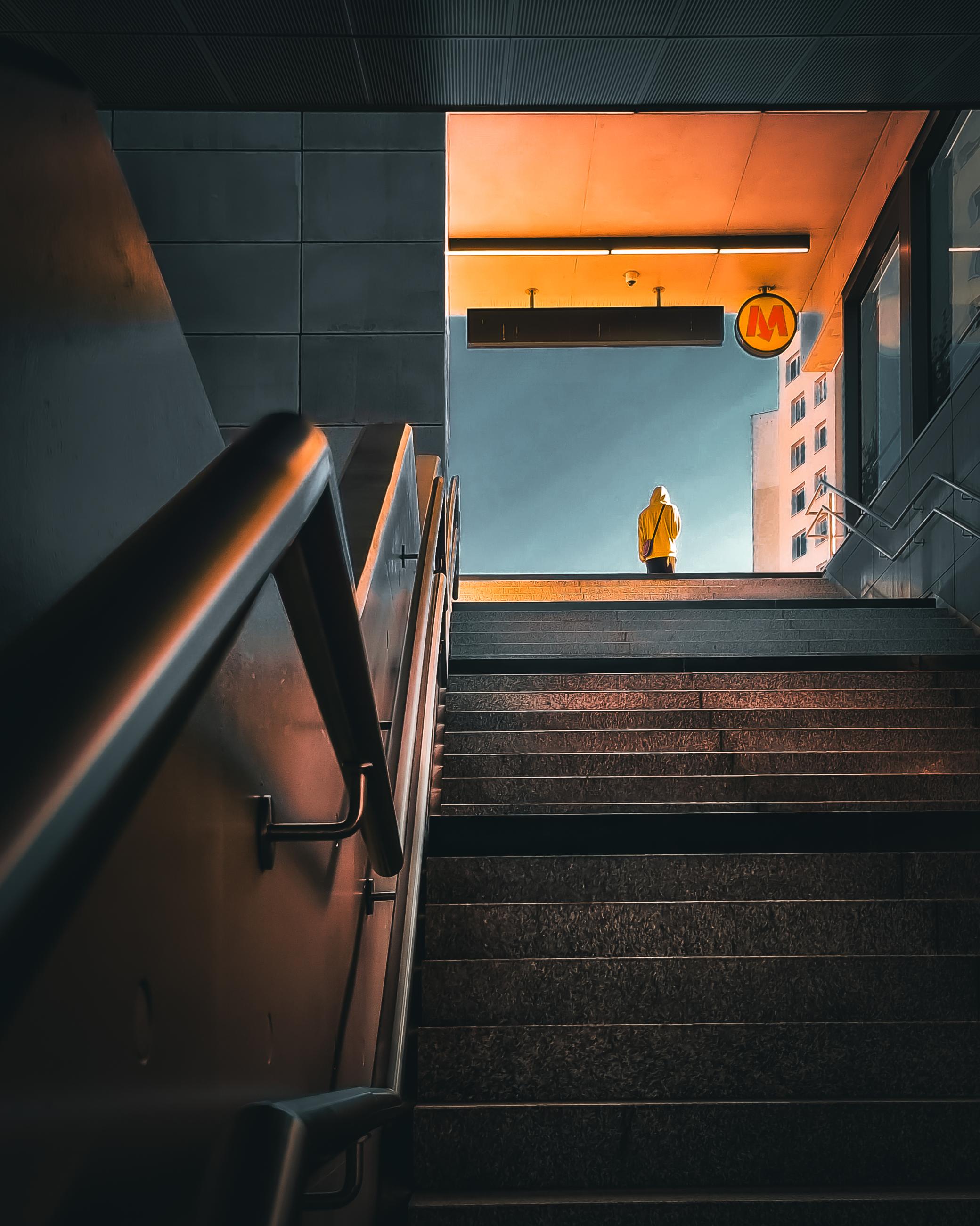 I was in Warsaw for a few days and one morning I decided to travel on the Metro and get out at every stop. As I was about to leave this station the sun appeared and I waited for someone to enter the frame at the top of the steps.